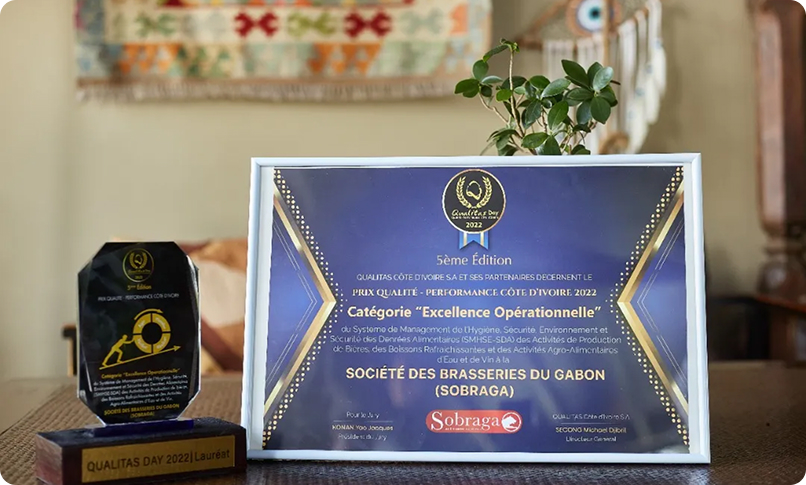 La Sobraga devient la première brasserie en Afrique francophone à obtenir les 4 certifications internationales pour la qualité (ISO 9001), la Sécurité et santé au travail (ISO 45 001), l’environnement (ISO 14 001) et la Sécurité des denrées alimentaires (FSSC 22 000).
